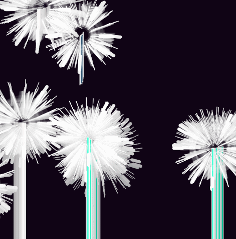 1 2 3 4 5 6 7 8 9 10 11 12 13 14 15 16 17 18 19 20 21 rect (x, height, 1 , -height+y);renderTrace_colorPoints (point,10 , 25 , 0.1 , 0.6 ,240 ,150 ,100 ,3 );ellipse (x,y,5 ,5 ); flowerScaleT = random (0.8 , 2 ); flowerDelay.val = round (random (200 , 250 )); flowerBright = 255 ; flowerColor = color (random (0 ,200 ), random (0 , 255 ), random (0 , 255 )); flowerScale.val = 0.0 ; flowerScaleT = 1.0 ; flowerWidth=40 ; flowerHeight=80 ; renderSpriteOnTrace_flower (x,y,flowerDelay,flowerBright, flowerColor,8 ,20 ,flowerScale,flowerScaleT);