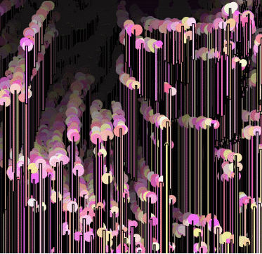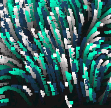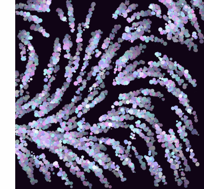 1 2 3 4 5 6 7 8 9 10 11 12 13 14 15 16 17 18 19 20 21 22 23 24 Particle .prototype .run = function ( ) { this .move (); this .checkEdges (); this .update (); }; Particle .prototype .move = function ( ){ this .angle =noise (this .loc .x /this .noiseScale , this .loc .y /this .noiseScale , frameCount/this .noiseScale )*TWO_PI *this .noiseStrength ; this .dir .x = cos (this .angle )+sin (this .angle )-sin (this .angle ); this .dir .y = sin (this .angle )-cos (this .angle )*sin (this .angle ); this .vel = this .dir .copy (); this .vel .mult (this .speed *this .d ); this .loc .add (this .vel ); }; Particle .prototype .checkEdges = function ( ){ if (this .loc .x < 0 || this .loc .x > width || this .loc .y < 0 || this .loc .y > height) { this .loc .x = random (width*9.2 ); this .loc .y = random (height); } };