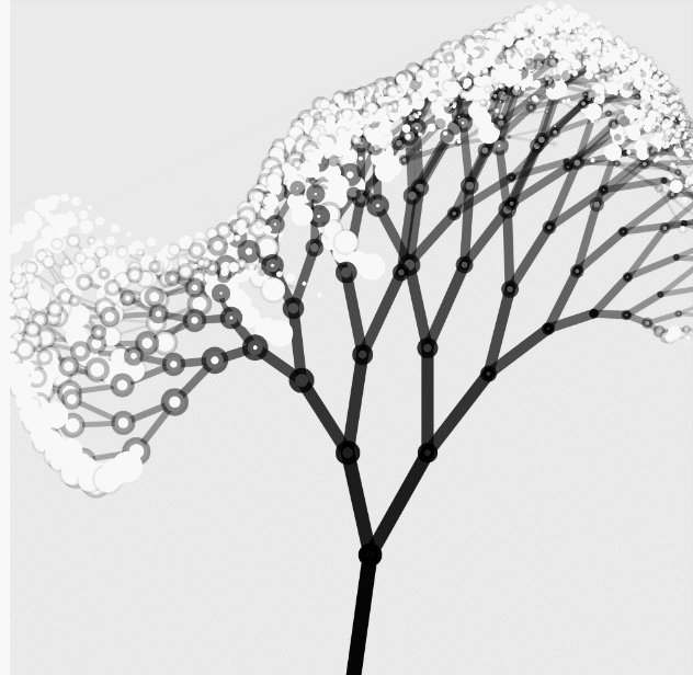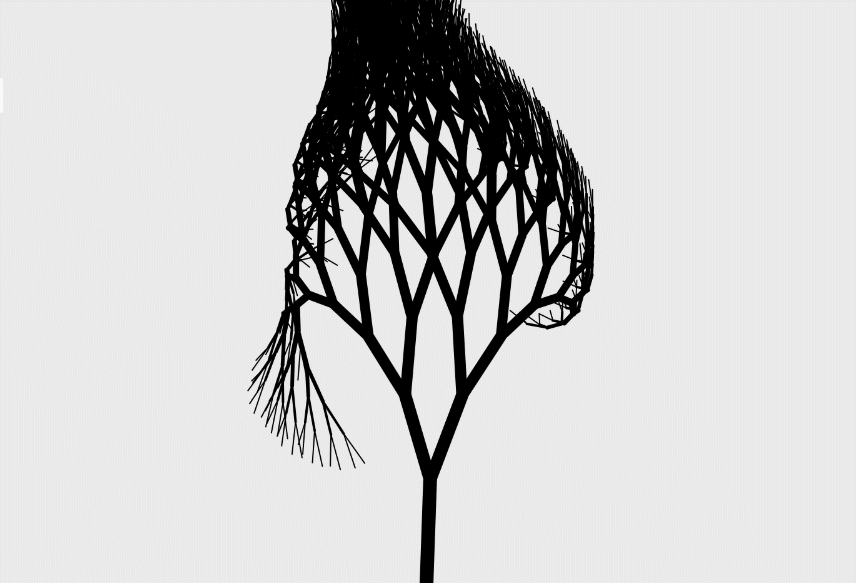 1 2 3 4 5 6 7 8 9 10 11 12 13 14 15 16 17 18 19 20 21 22 23 24 25 26 27 28 29 30 31 32 33 34 35 36 if (c){ d=19 -c/2 ; strokeWeight (c--); stroke (0 ,0 ,0 ,c*25 ); n=noise (x/w-t,y/w+t)*d; if (type==0 ){ ellipse (x+=l*cos (r)+d*cos (n),y+=l*sin (r)+d*sin (n),r*4 ,r*4 ); } else if (type==1 ){ line (x,y,x+=l*cos (r)+d*cos (n),y+=l*sin (r)+d*sin (n)) } for (i of [.4 ,-.4 ]) { renderTrace_trees (x,y,r+i,type,c,l*.83 ) } } else { var point=[]; point[0 ]=x; point[1 ]=y; }