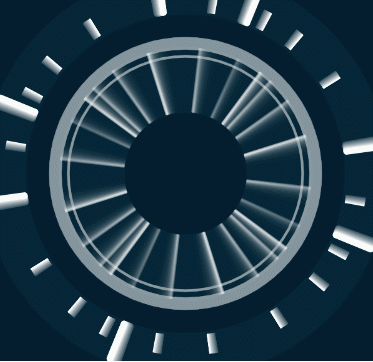 1 2 3 4 5 6 7 8 9 10 11 12 13 14 15 16 17 18 19 20 21 22 23 24 25 26 27 28 29 push (); translate (x,y); stroke (255 ,30 ); strokeWeight (10 ); noFill (); ellipse (0 ,0 ,midR*2 ); strokeWeight (2 ); ellipse (0 ,0 ,midR*2 *0.9 ); rotate (noise (frameCount/150 )*2 + mouseX/50 ) for (var i=0 ;i<rotateCount;i+=1 ){ rotate (i*PI *2 /rotateCount) stroke (255 ,30 ) strokeWeight (2 ) line (50 ,0 ,midR*0.9 ,0 ) push () strokeWeight (( i%5 ==0 ?5 :1 )) stroke (255 ) rotate (cos (-frameCount/80 )*2 ) line (midR+30 ,0 ,midR*1.2 +( i%5 ==0 ?10 :-5 ),0 ) pop () } pop ();
