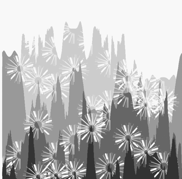 混合渲染效果 :我把rect逐条填充群山曲线渲染,针对点的色彩渲染 ,以及旋转花朵效果结合在一起,误打误撞得到了还不错的效果(缺点是可控性比较弱):