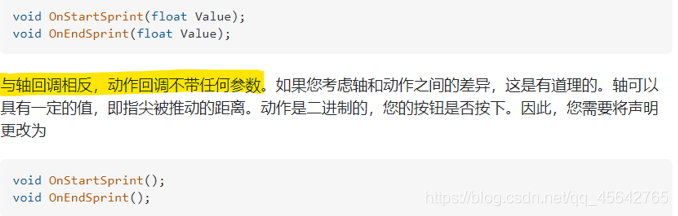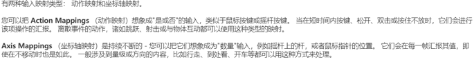 关于动作映射和轴映射,我查了一下具体有啥区别。在代码实现上最大的区别就是动作映射绑定的函数不能带参数,而轴映射需要参数。