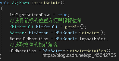 首先,先在之前按下鼠标右键绑定的函数startRotate里添加如下所示的代码。与移动鼠标思路一致,获取鼠标的当前位置和物体的当前旋转角度。