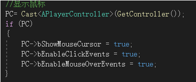补充一点:需要注意的的是编译运行之前,需要设置鼠标在play界面可见,不然运行的时候就看不到鼠标,把这一段代码添加到BeginPlay()函数里: