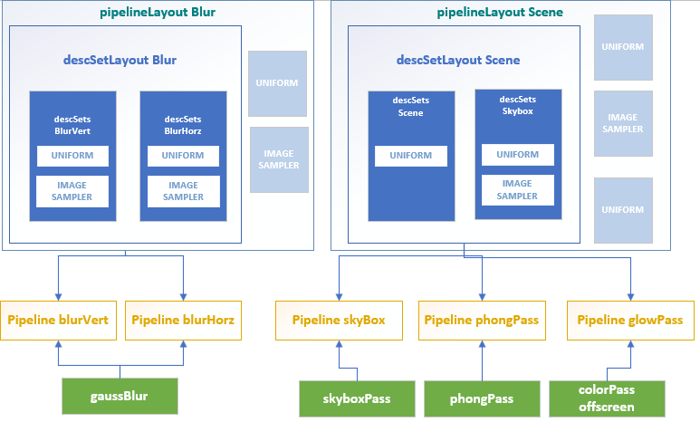} descriptorSetLayouts;在setupDescriptors(),需要设置后处理pass的descriptor layout,把后处理pass需要用到的资源绑定到流水线中。